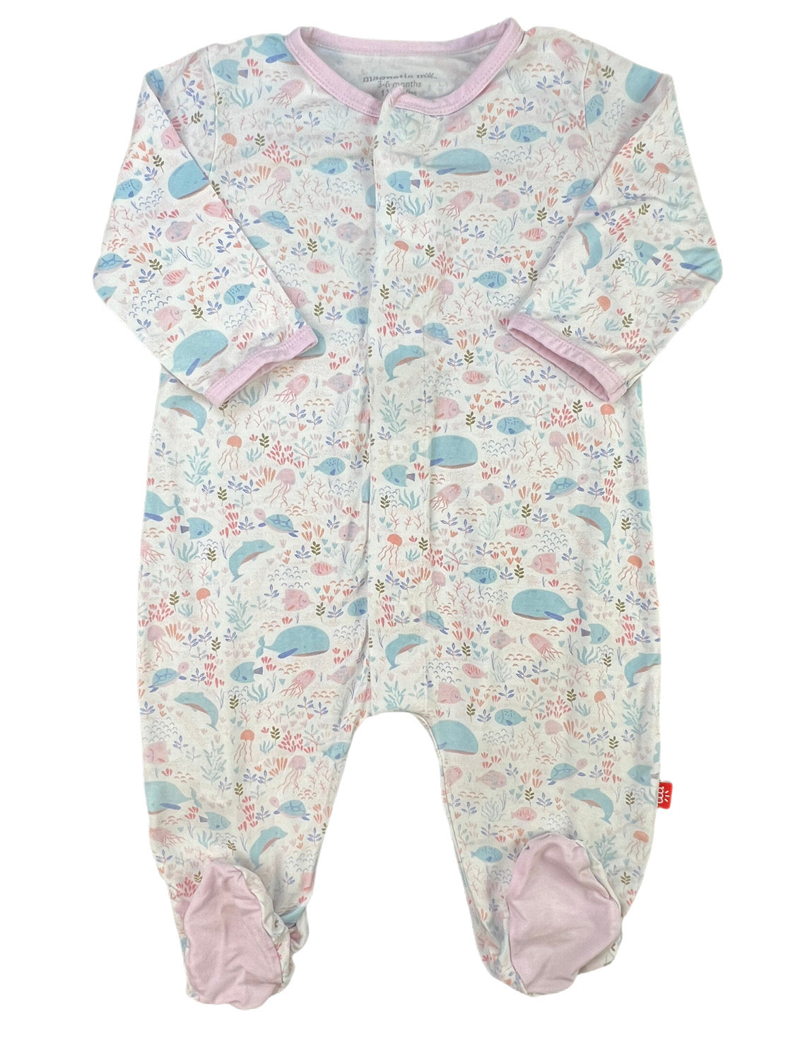 Long Sleeve White Footie with Pink Trim and Ocean Creatures Print