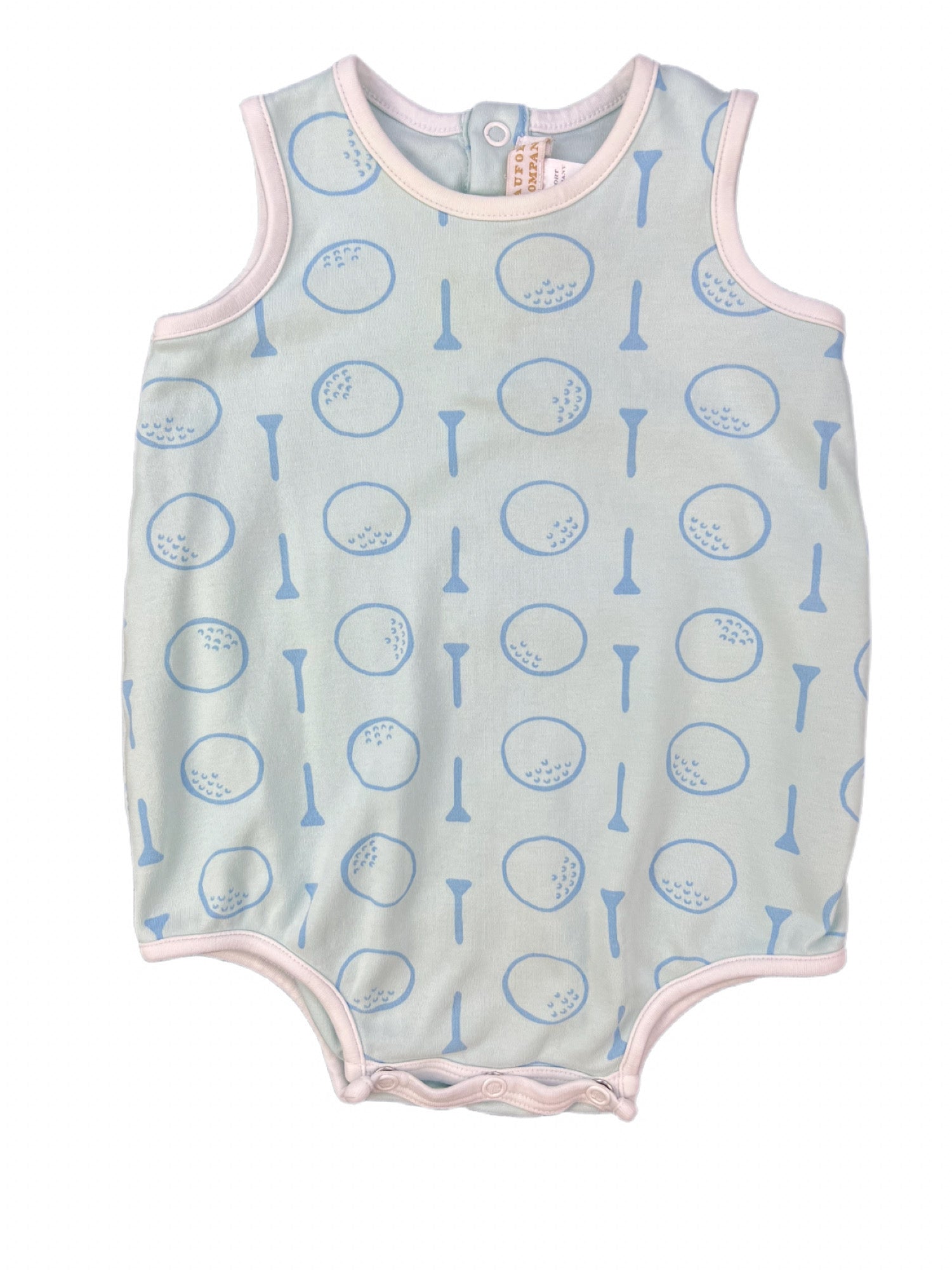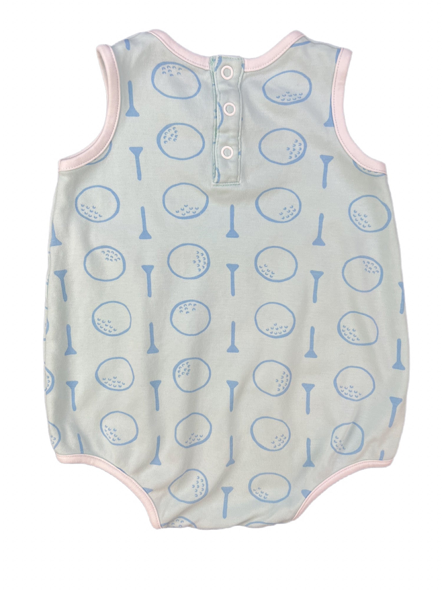 Light Blue Sleeveless Pima Cotton Golf Print Bubble Romper with White Trim