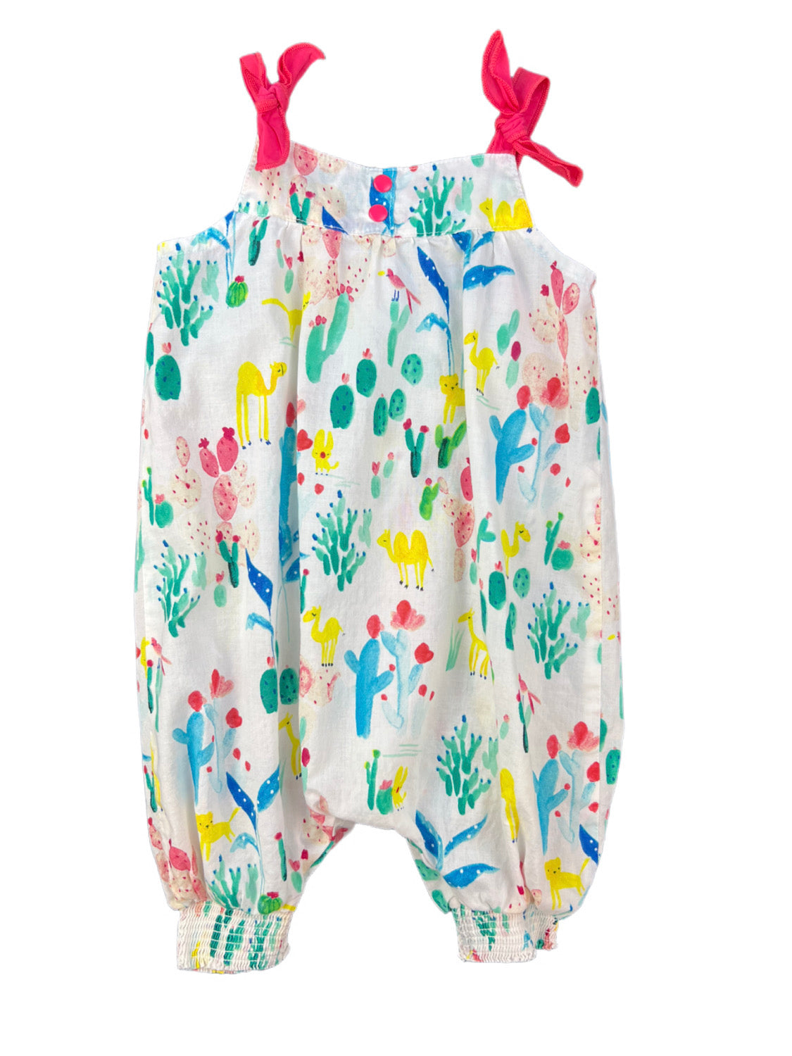 White Sleeveless Cotton Romper with Watercolor Cactus Print