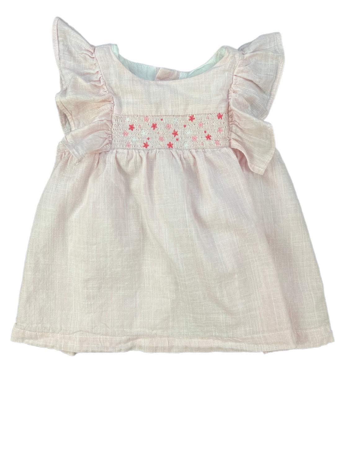 Pink Ruffle Sleeve Smocked and Embroidered Dress