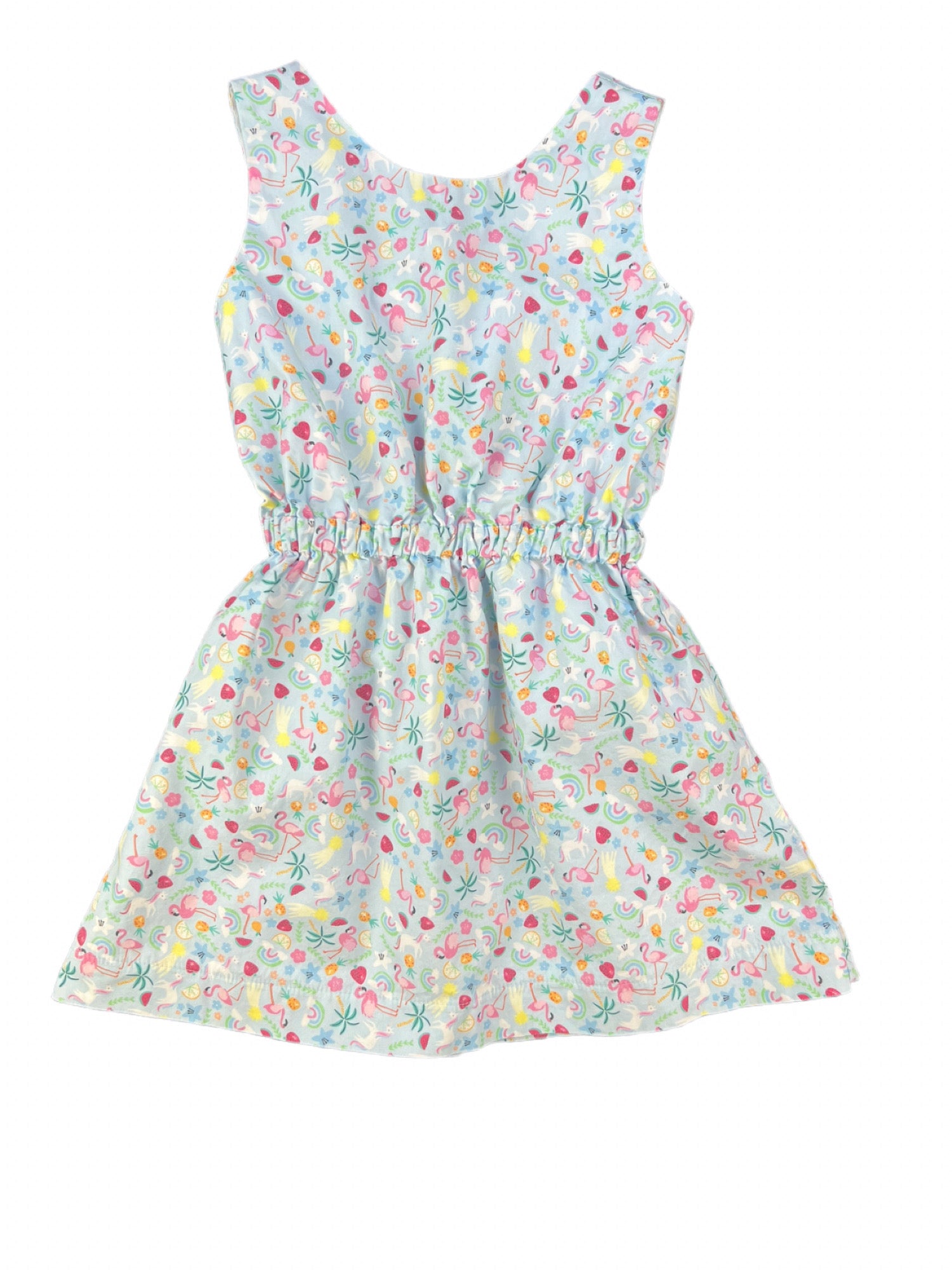 Light Blue Sleeveless Back Tie Dress with Elastic Waist and Multicolor Print