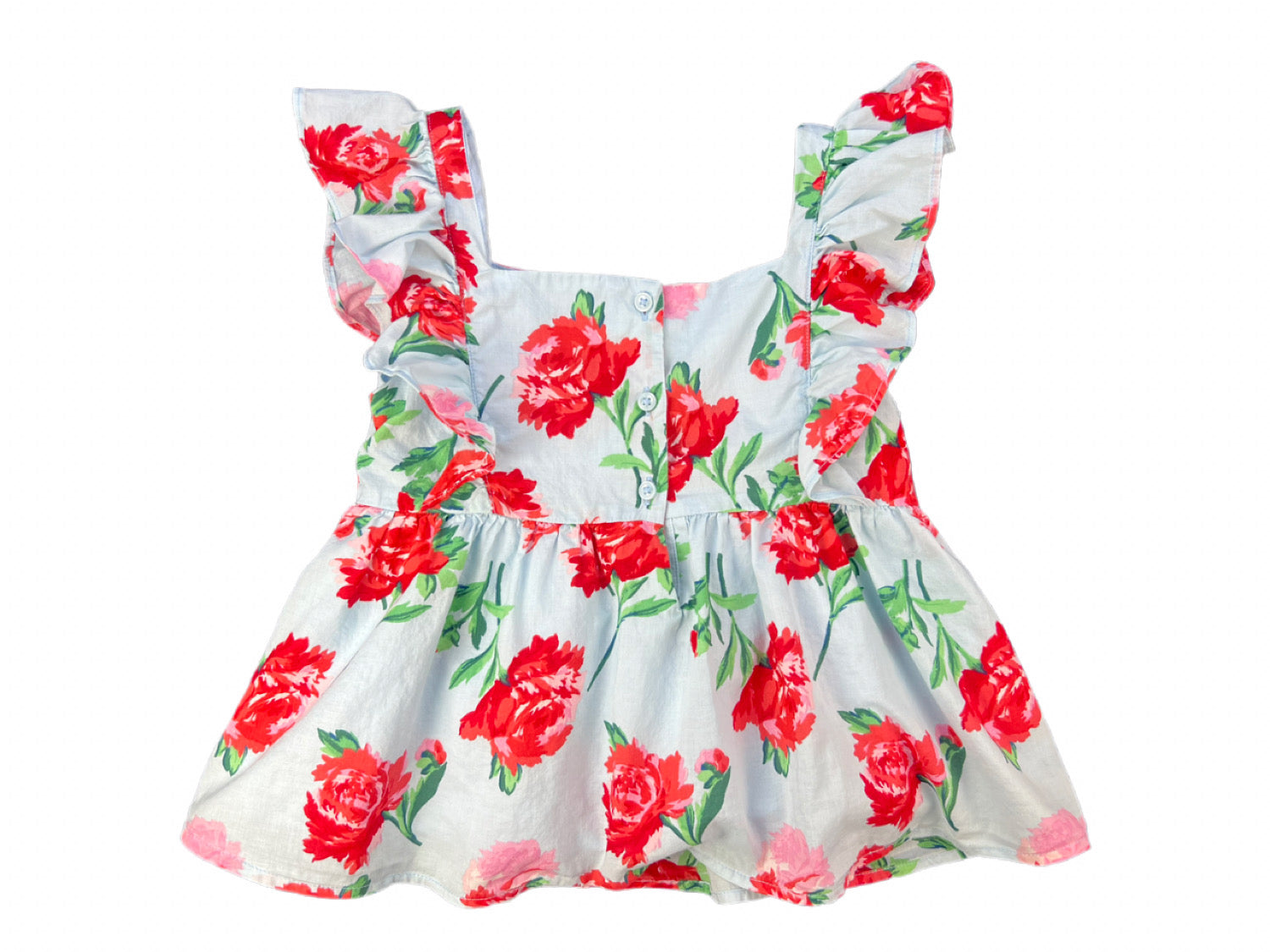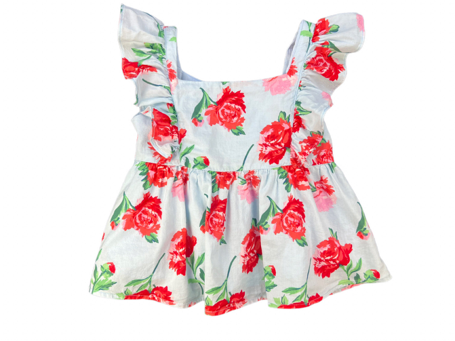 Blue Flutter Sleeve Top with Red Pink and Green Floral Print