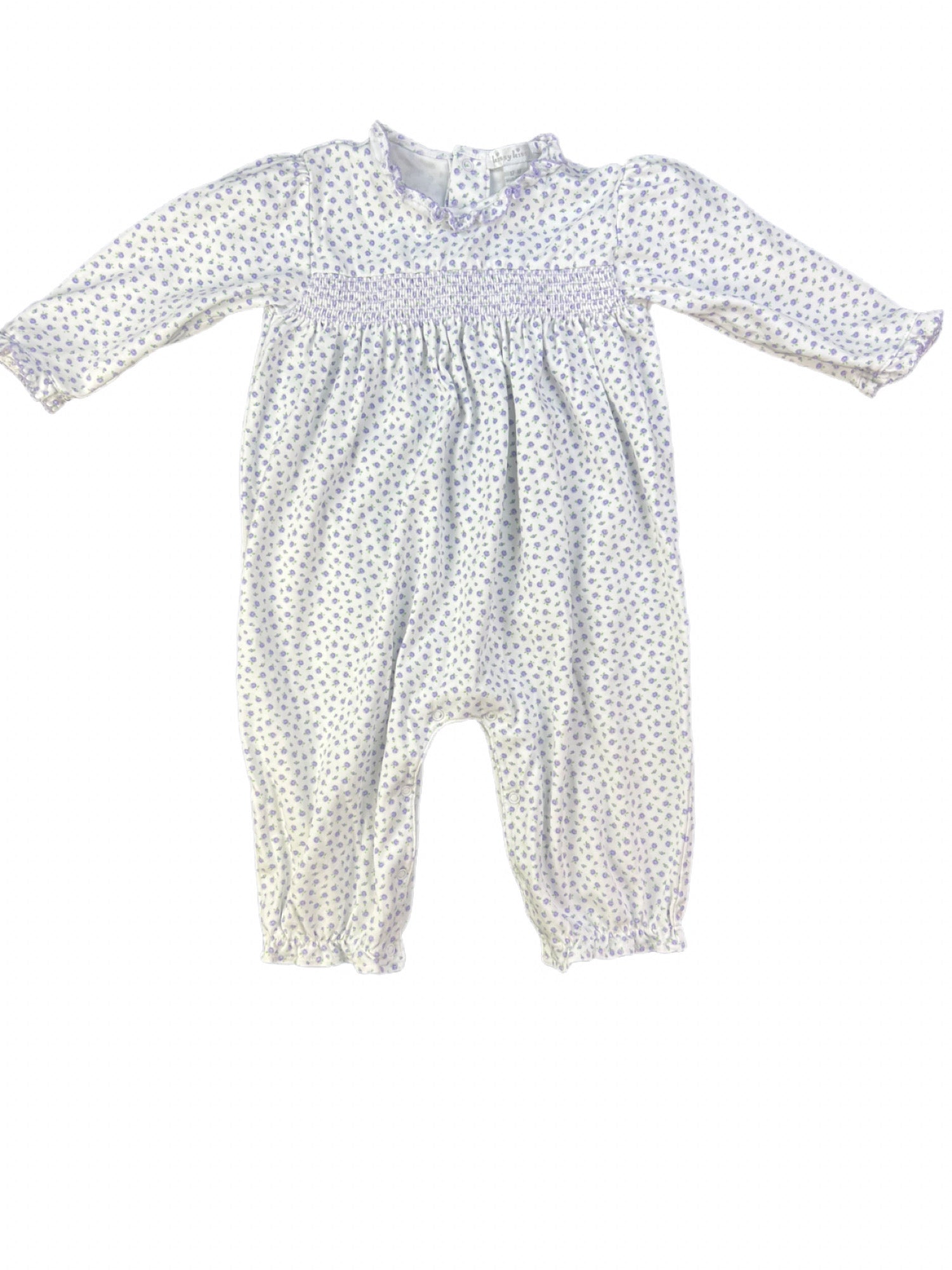 White Long Sleeve Pima Cotton Smocked Romper with Purple Floral Print
