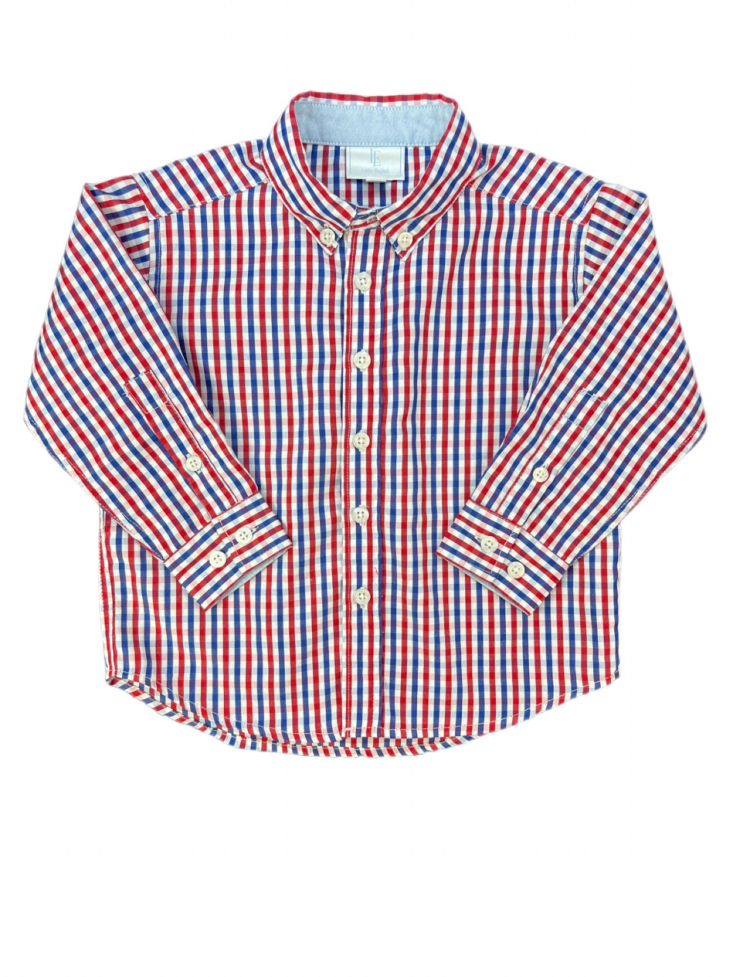 Red White and Blue Check Long Sleeve Polyester Button Down Shirt