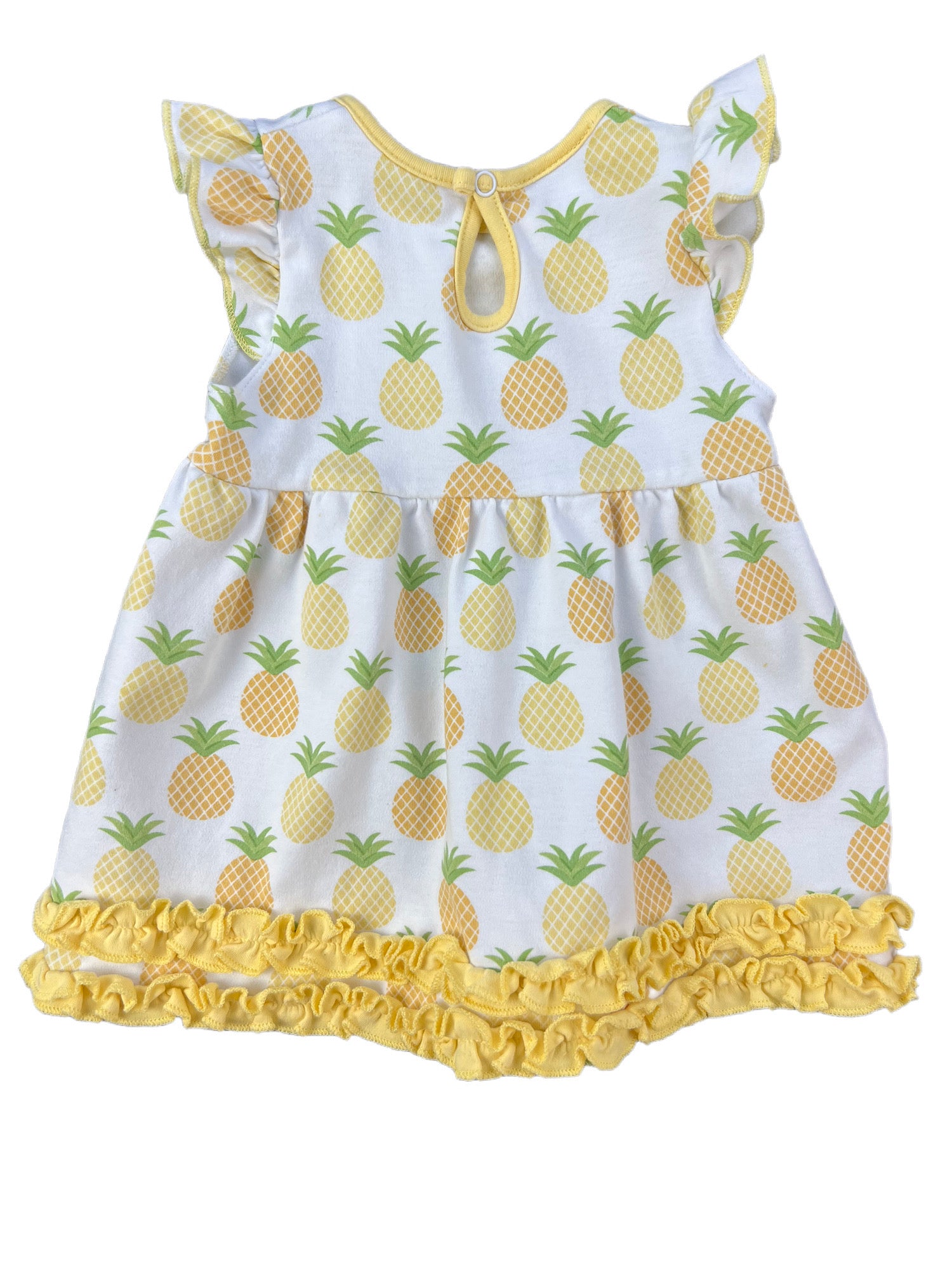 White Ruffle Sleeve Pima Cotton Pineapple Print Dress with Yellow Trim