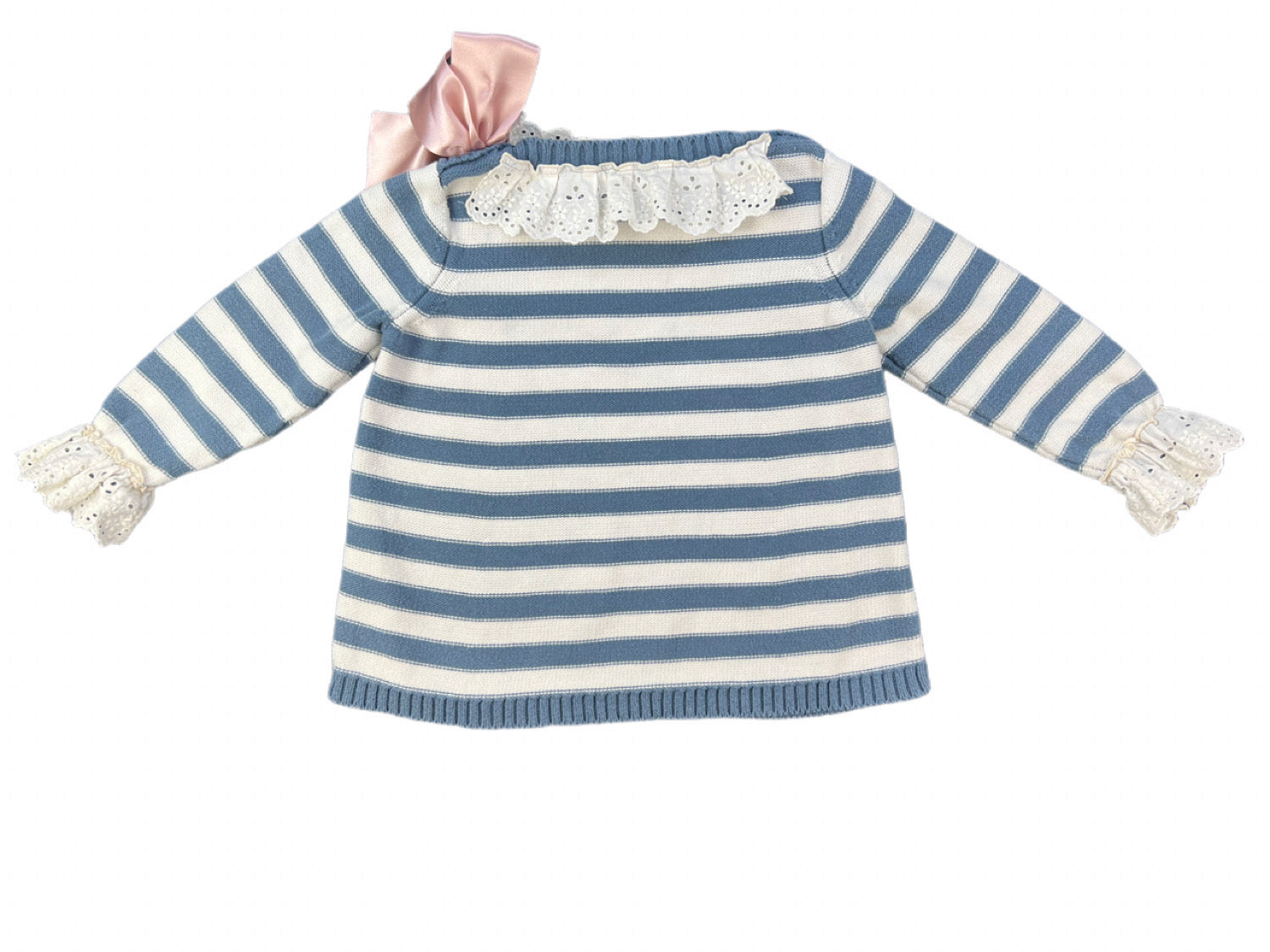 Navy and White Stripe Long Sleeve Knit Sweater with Lace Trim