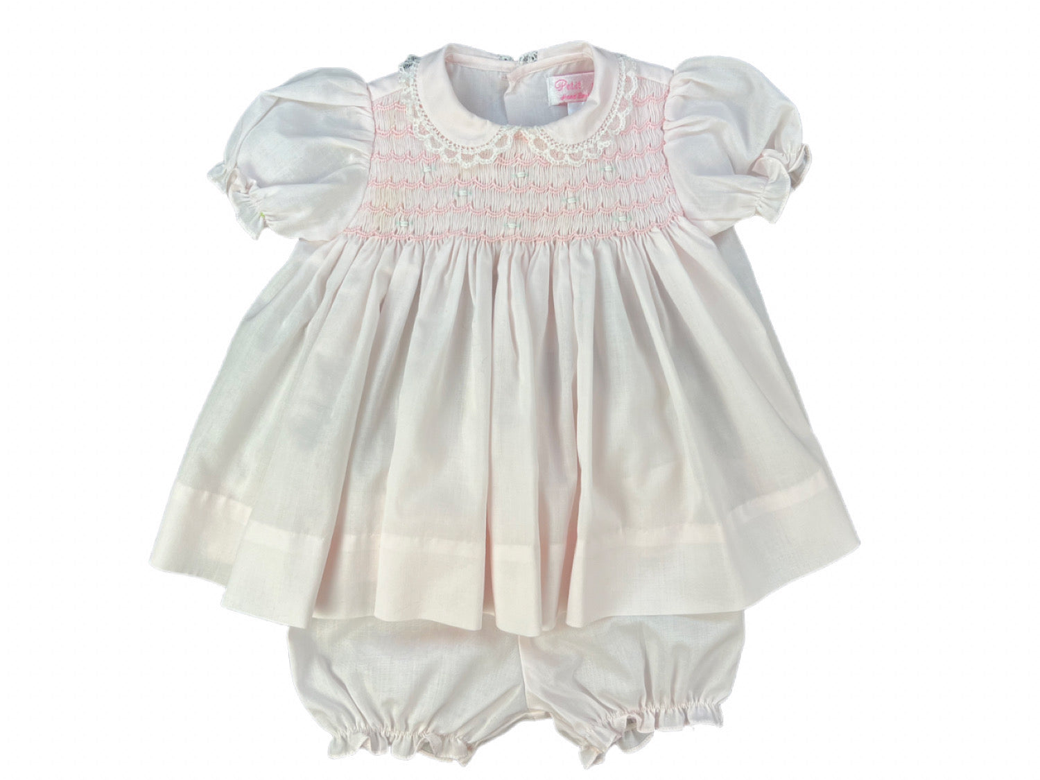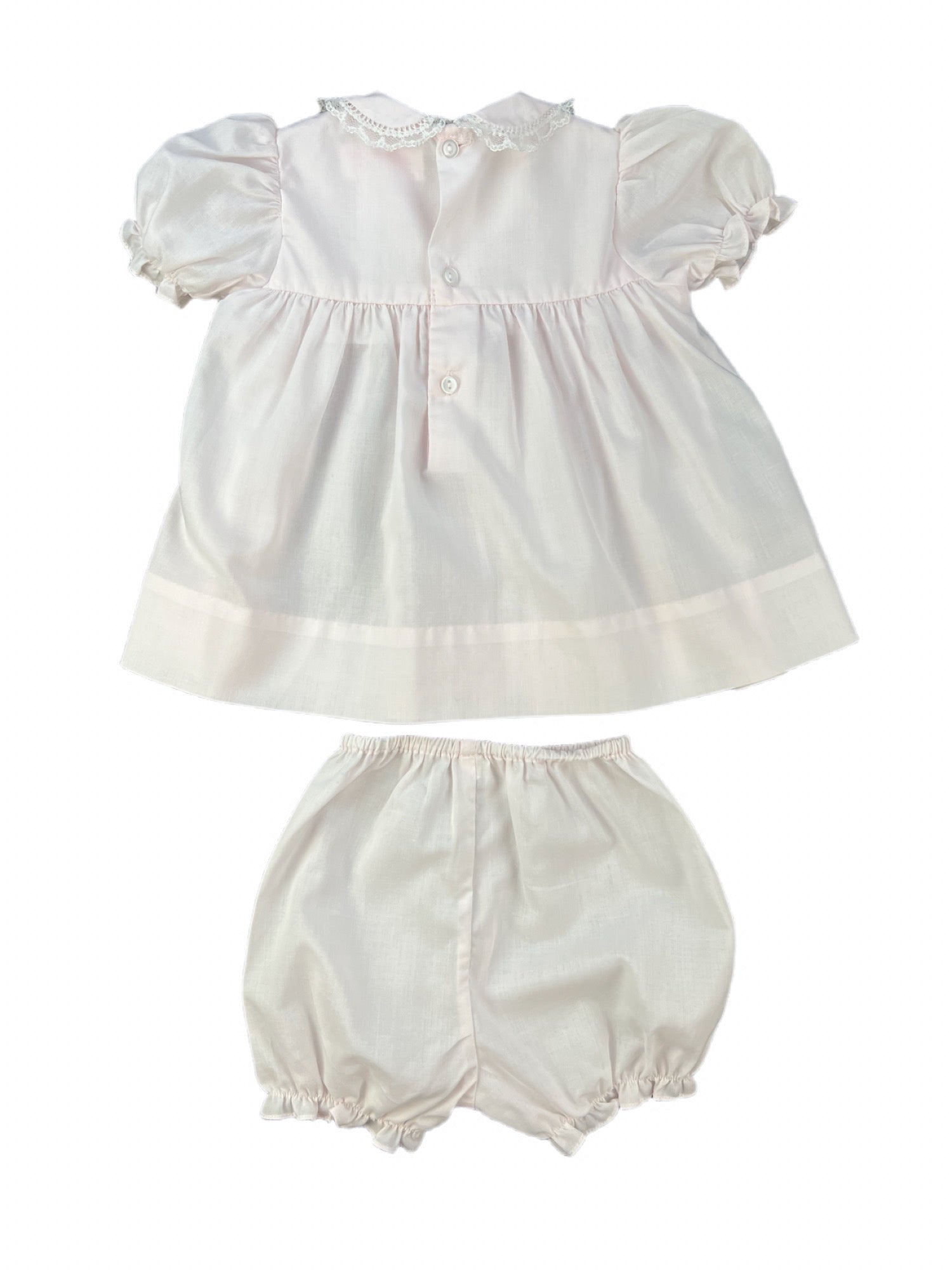 Pink Short Sleeve Smocked and Embroidered Dress with Bloomers