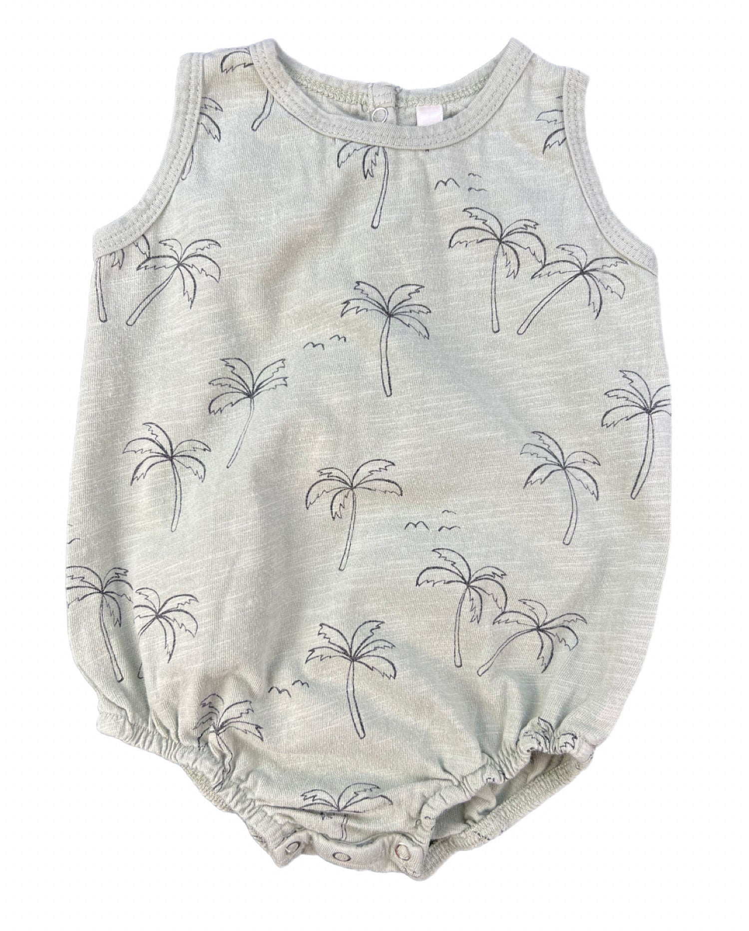 Pale Green Sleeveless Relaxed Palm Tree Print Bubble Romper