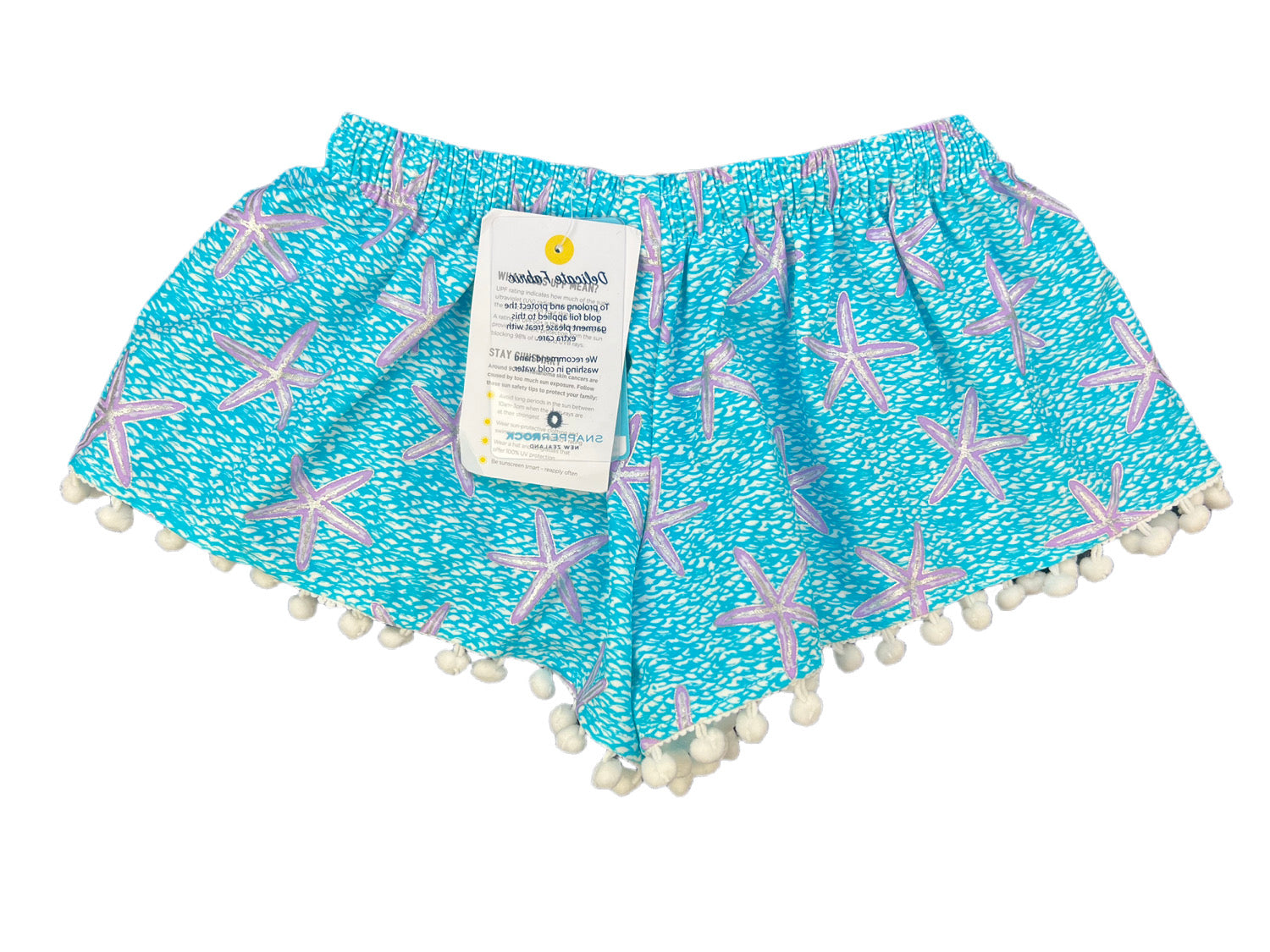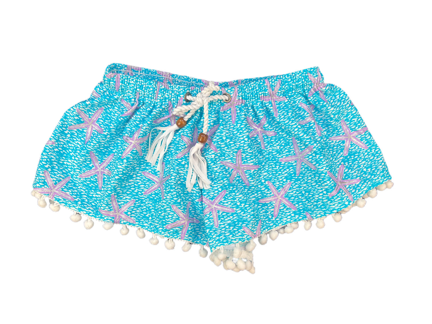 Blue and Purple Starfish Print Drawstring Waist Shorts with White Pom Poms